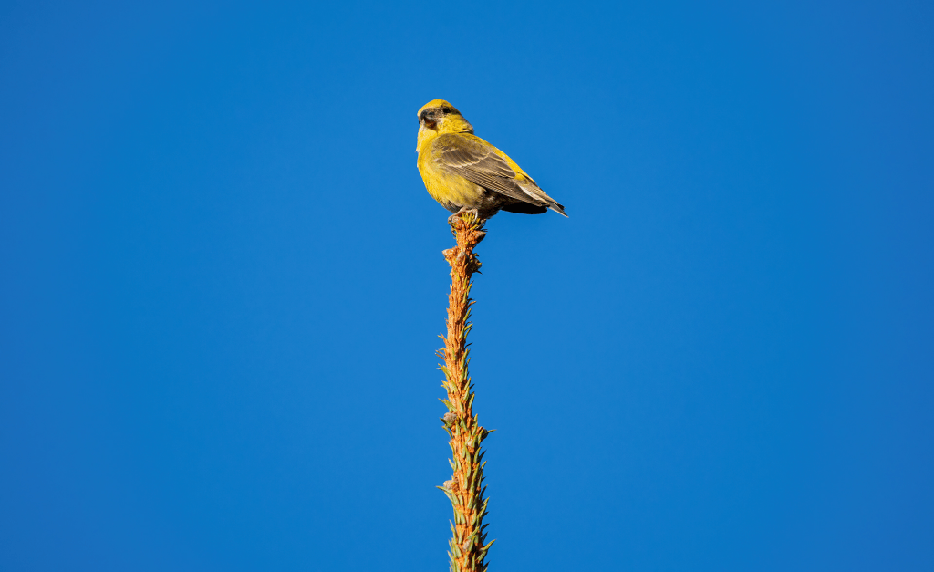 We went our separate ways and about 100 yards further on, Jo said “What’s that?” We could hear a bird call and looked all around us until we spotted her, right in front of us at the tip of a young pine tree, a beautiful yellow female crossbill, a first for both of us.