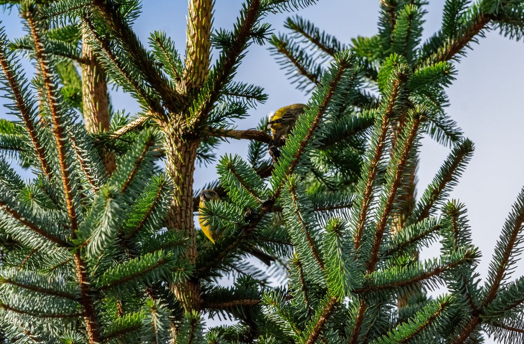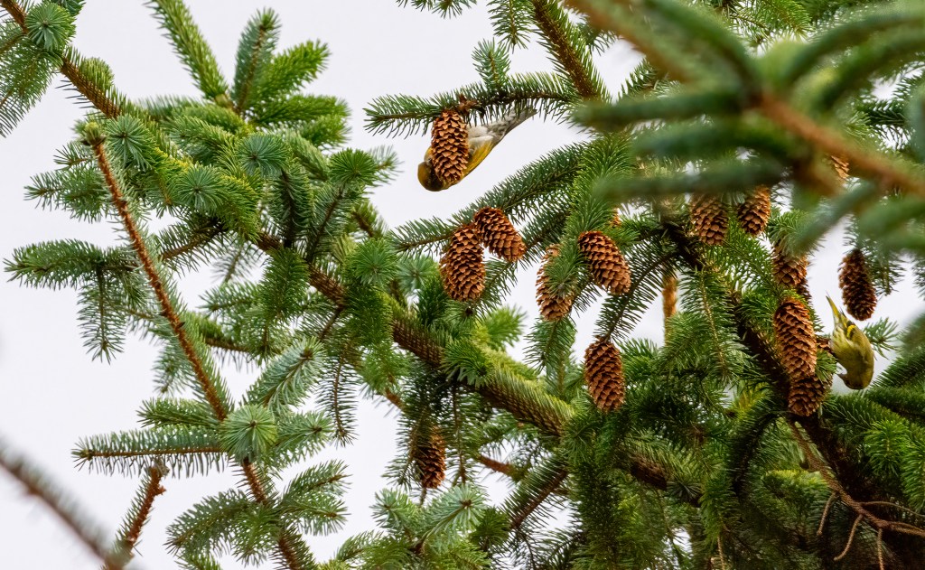 There was a Siskin in the same tree right next to her, both munching away on pine cones.
