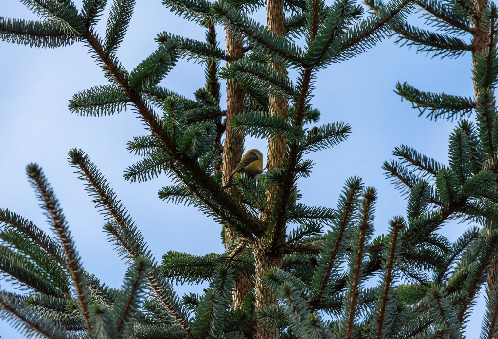 We clambered back down to the path again and the lady went her way back, I carried on up the track. I hadn’t gone far when I spotted a bird in a pine next to the track.