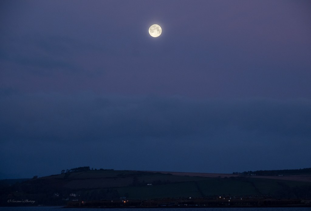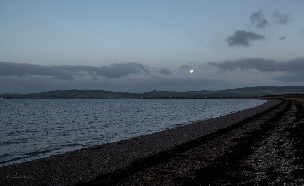 Looking in the opposite direction, where I was walking to, the full Moon was shining brightly. That is the Black Isle on the far horizon.
