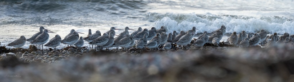 I went down the ramp onto the grass and started along the shore where I spotted a flock of mixed waders roosting, Knot and Godwit as far as I can tell?