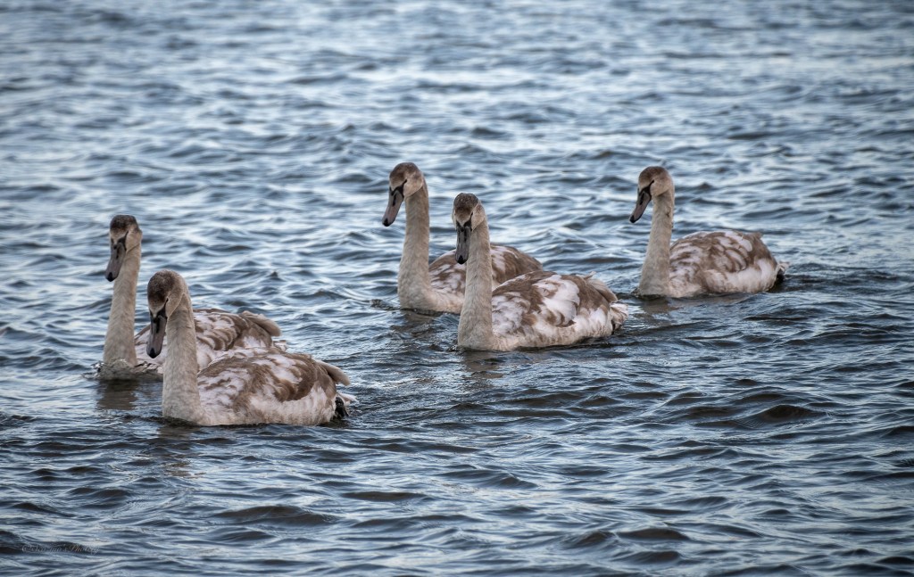 The swan family had now rounded the point and were heading into the bay, catching the morning sunlight.
