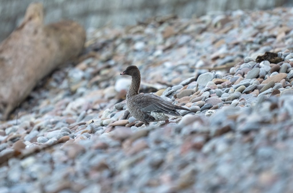 A flock of waders flew by but, yet again, too fast for me, so I made do with a family of Mute swans who swam past more sedately. I was also watching a hooded Crow picking at something on the beach when a single Pink-footed goose waddled down the pebbles towards the shoreline.