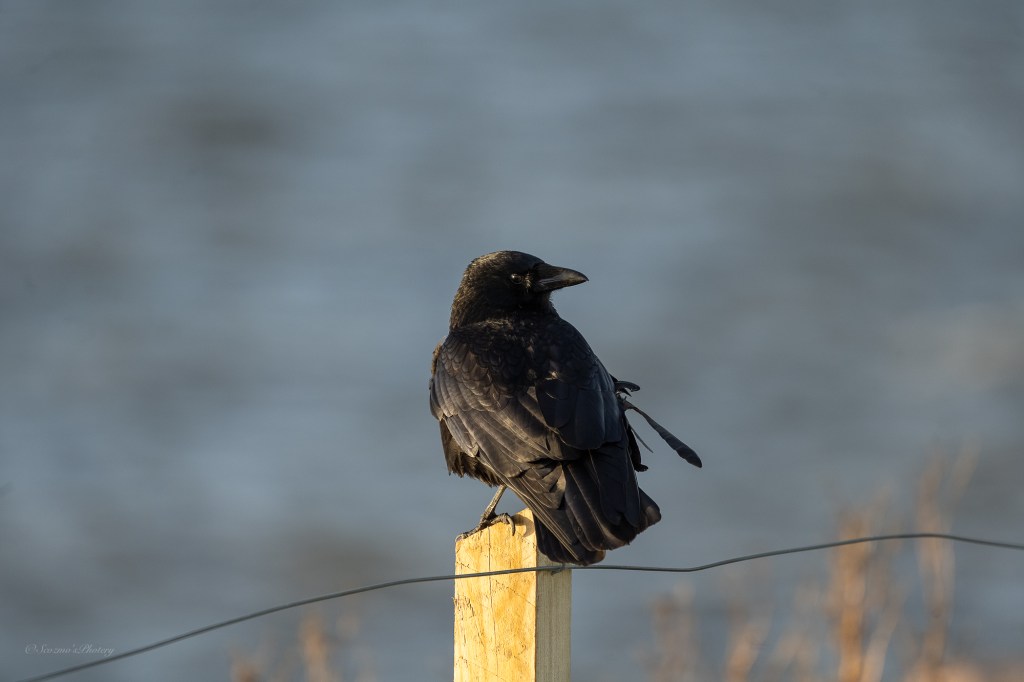 Along the shoreline again, still on the grassy bank and I walked close by a Crow on a fence post which didn’t move but kept a watchful eye on me.