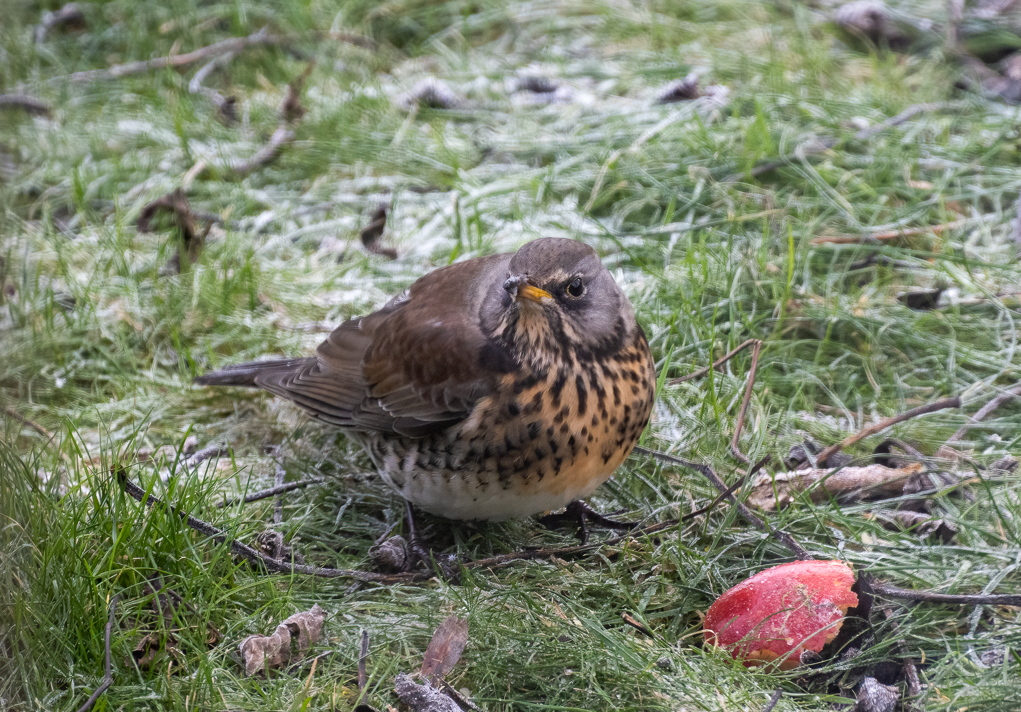 It appears that they really do not share with other Fieldfares! This was nasty! One flew off, the other strutted around a bit, showing off.