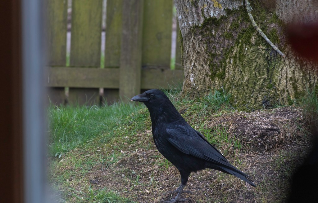 This shot shows how clever these birds can be, an adult Carrion Crow on our fence, peeping under the leaves on the tree to check if I’m still around!