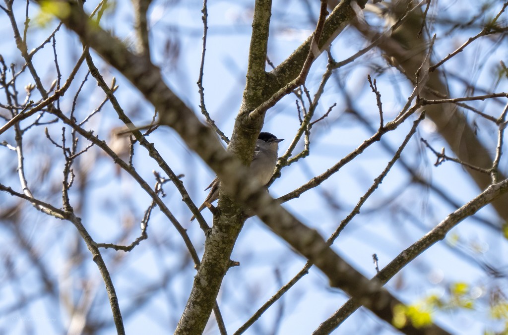 As I reached an old gnarly Apple tree, I could hear a Blackcap calling in the surrounding trees so I attempted to track and photograph it. Let me tell you, I have deleted a lot of grey blurry blobs partially hidden by green blurry blobs! But, I think I got him, I at least spotted that he was male, I did catch a fleeting glimpse of what may have been another, a female??