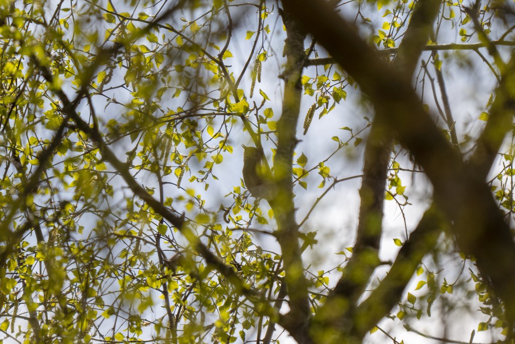 So, I started back up the hill, back past the feeding area, noting the back end of a jay disappearing into the woods and on past the junction where I heard a Warbler calling. I stopped and switched on Merlin which reckons it was a Chiffchaff so, I scanned around in the tree in front of me but heard a very quiet peep behind me.