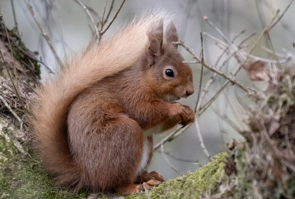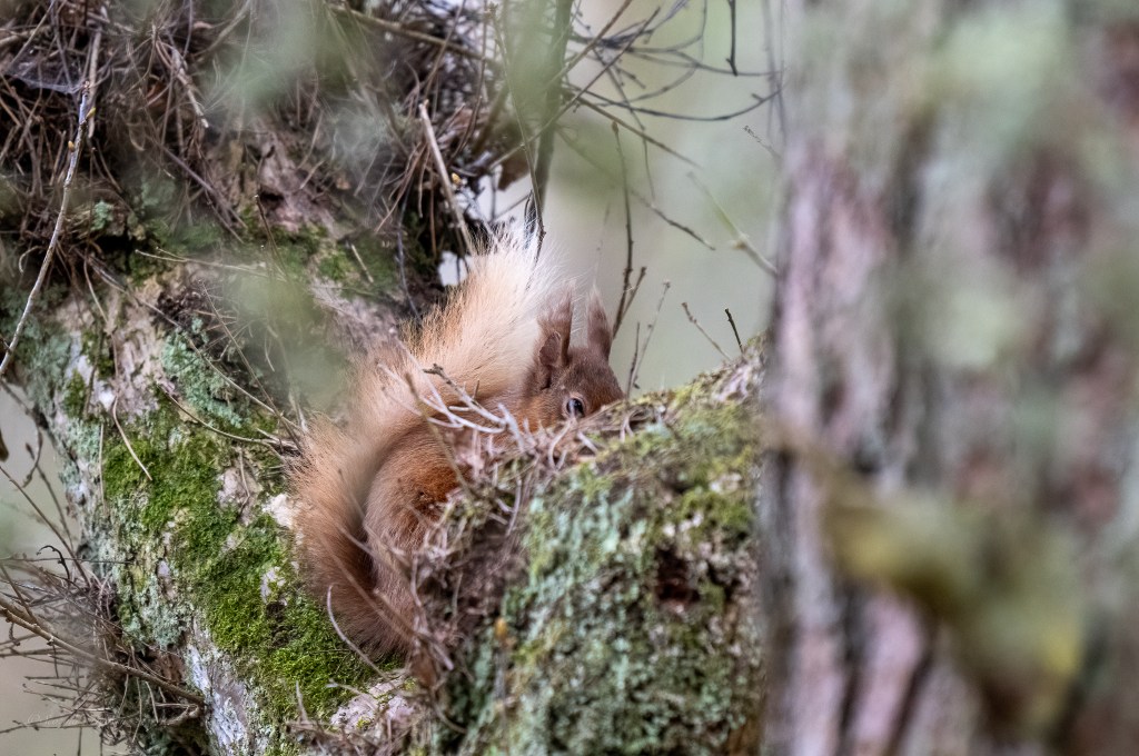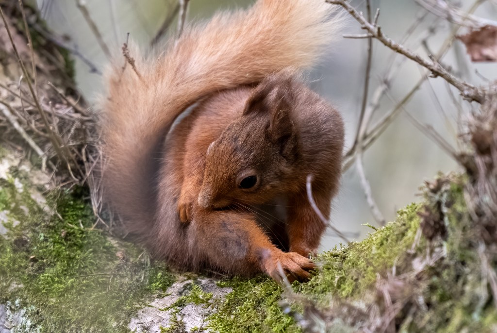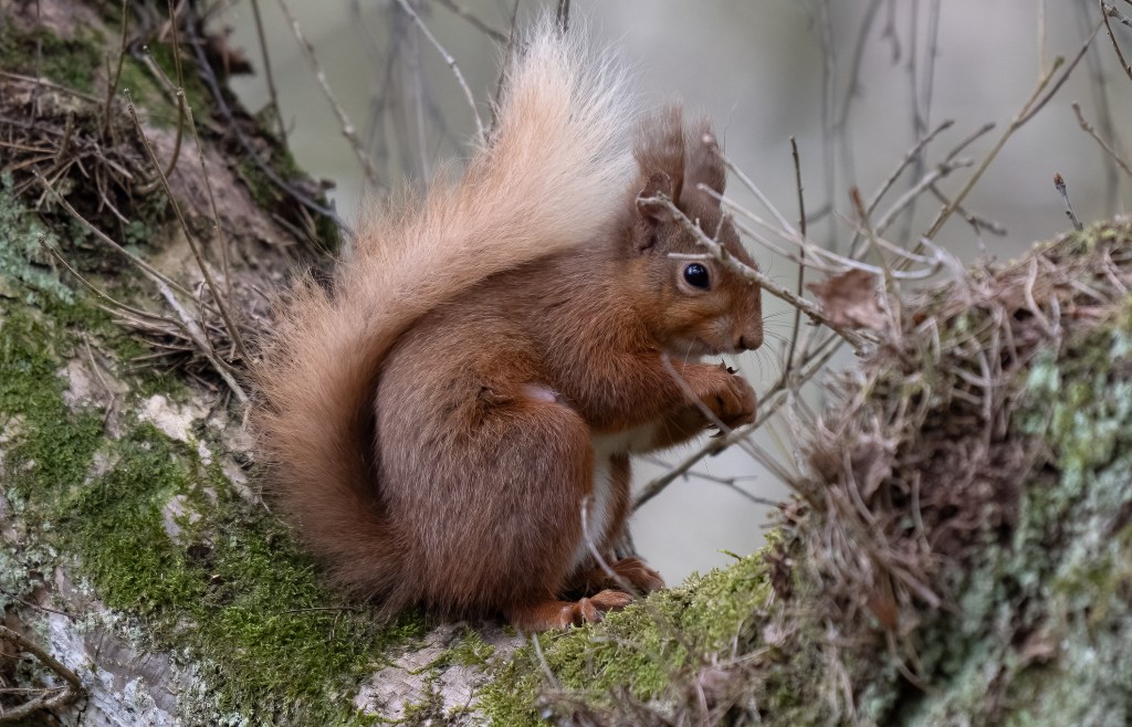 As I approached the old oak feeding area, the Red Squirrel came scurrying over the brow of the hill and running towards me; stopped for a quick look then turned up towards the feeding posts.