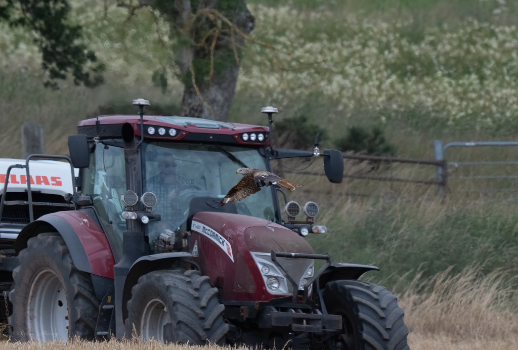 Now, if you didn’t realise it, harvesting in a field like that disturbs all sorts of beasties so, the machines are tracked from above by Buzzards, Red Kites, some Corvids and a Black-backed Gull or two. I was also harvesting after a fashion, I was on my ride-on mower, this side of the fence cutting the largest area of grass while it was reasonably dry but also watching the birds so, when I took a break, I set up a tripod and camera….