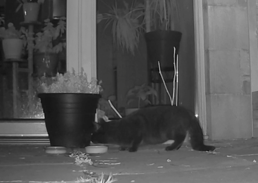 A black cat turned up and ate its fill too!
