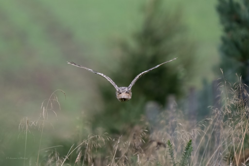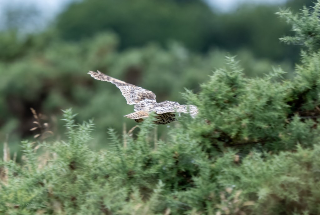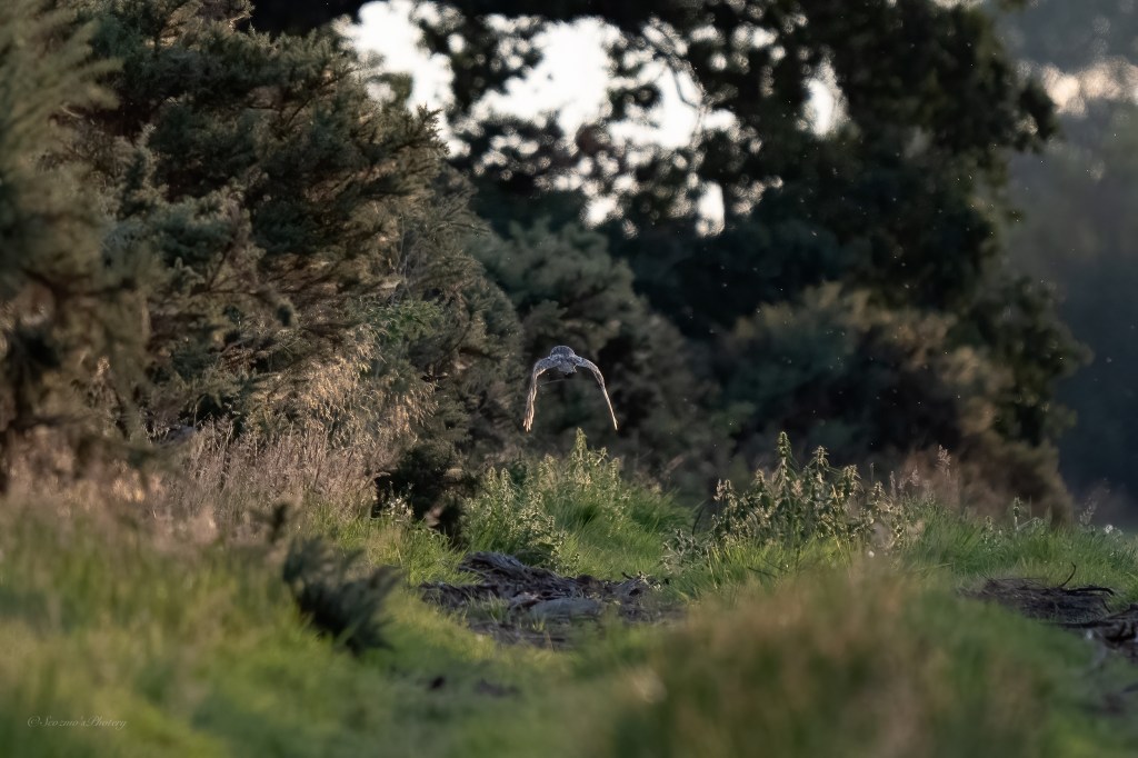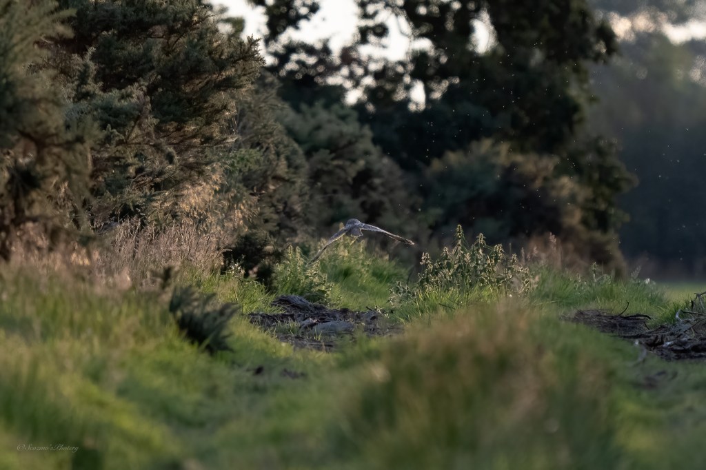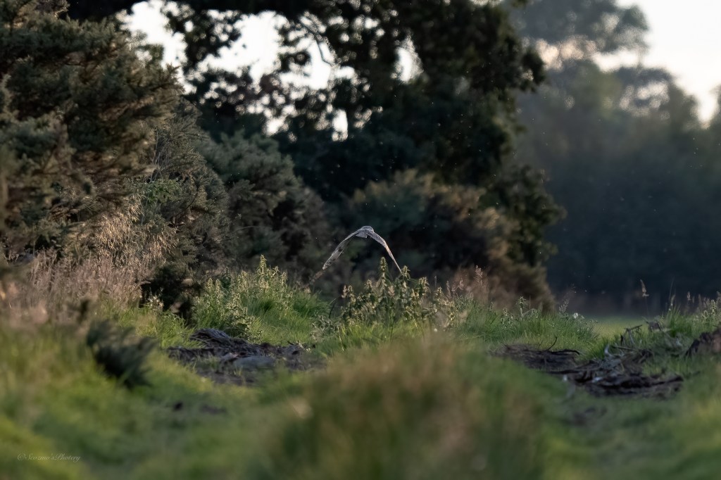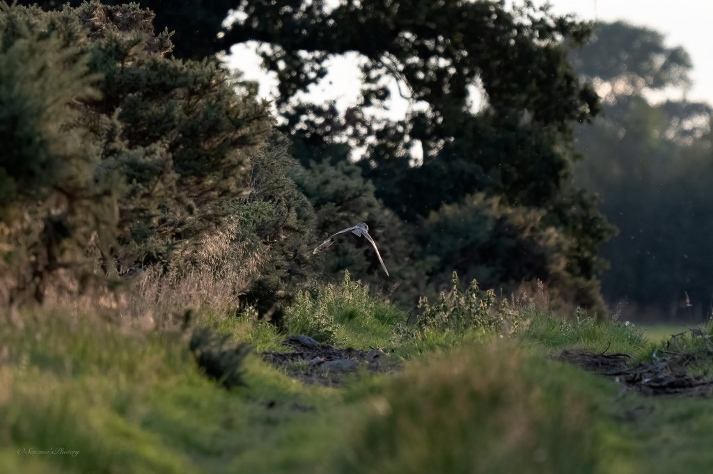 Hah! What I took to be another bird, took flight from the Gorse on the left and flew ahead of me down the lane and, I convinced myself this one was a Short-eared owl however, on looking very closely at the shot showing the face I feel it’s more likely to be Long-eared. Two species on the same patch would be too much right?