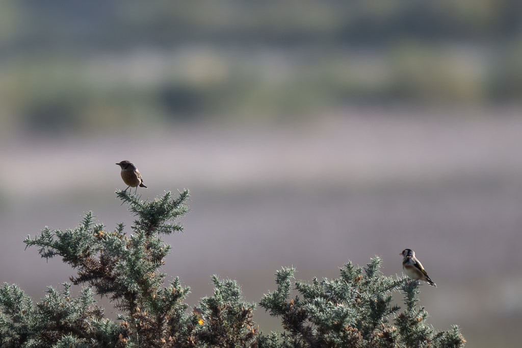 Lots of Goldfinches over the weeds in the reed beds, at least one family of Stonechats flitting over the same or the Radish crop in the field.