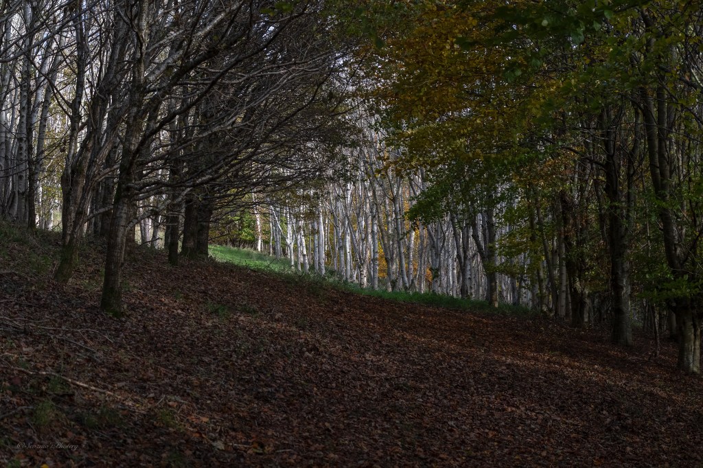 The Silver Birch were lit up by the sunlight and a Beech beyond was glowing bright golds and yellows. The big Beech in the line of trees caught my eye too … dare to be different 🙂