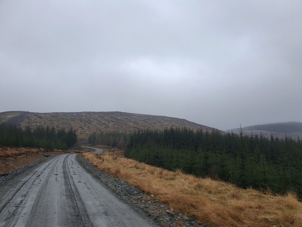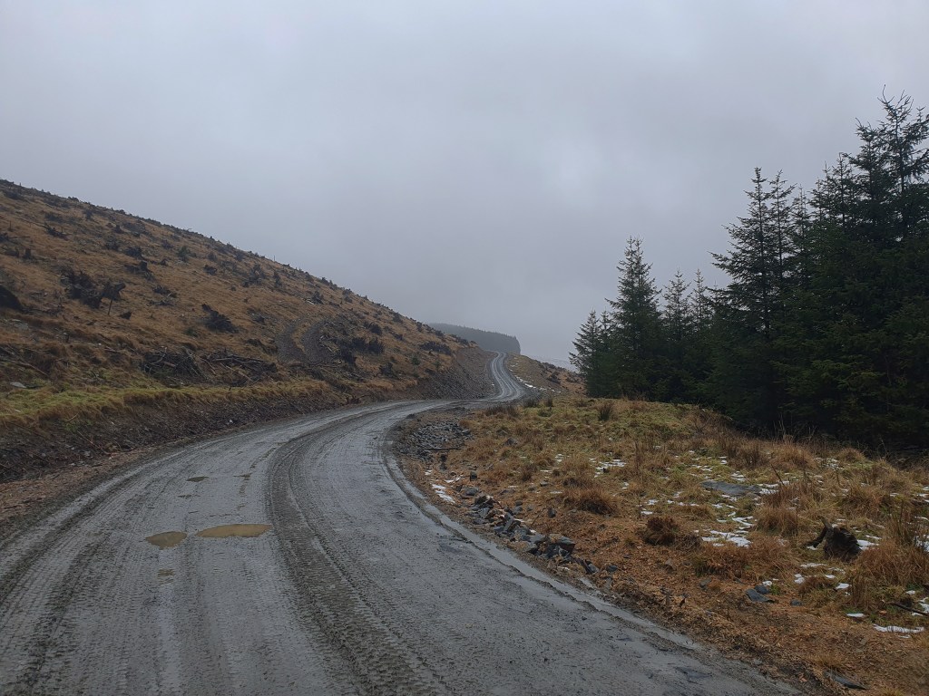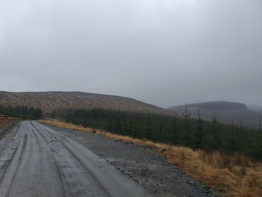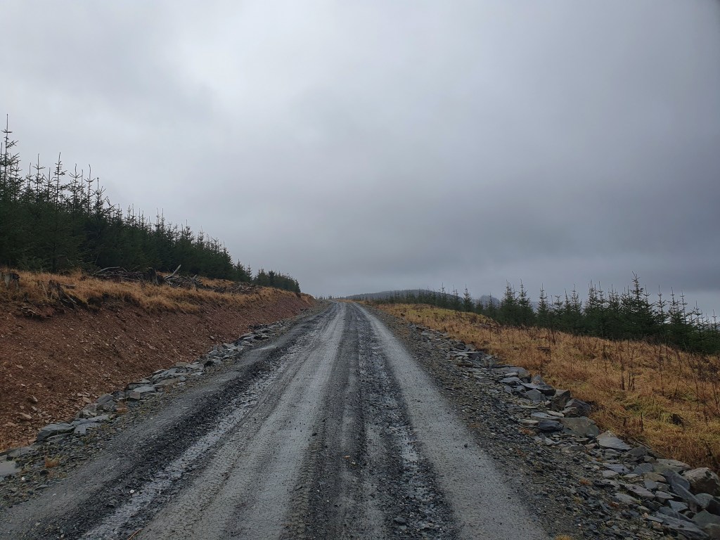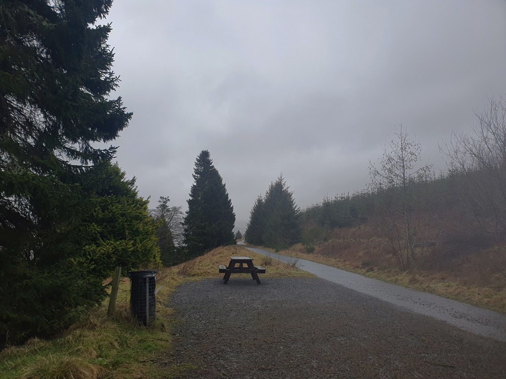 There had been only one car in the car park, no surprise really and that was my reasoning for a walk up here on a weekend, not something I usually consider but, given the weather, good call. You can just see the distant road heading up the hillside, that’s the relatively new logging road as they clear all the mature and fallen wood from the hillsides and today ….. what the heck? It’s Saturday, they won’t be working in this weather so, I’m heading that way, for a change.