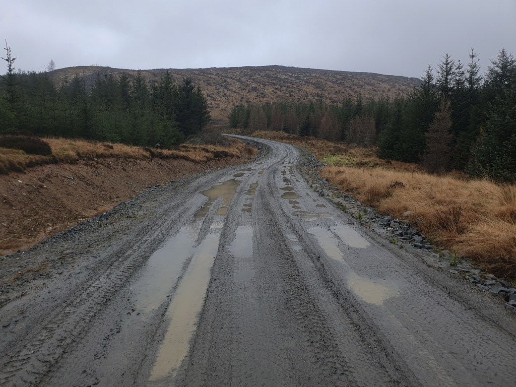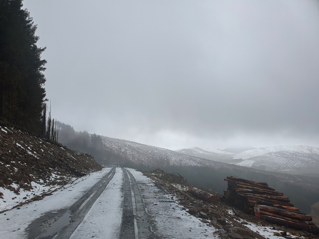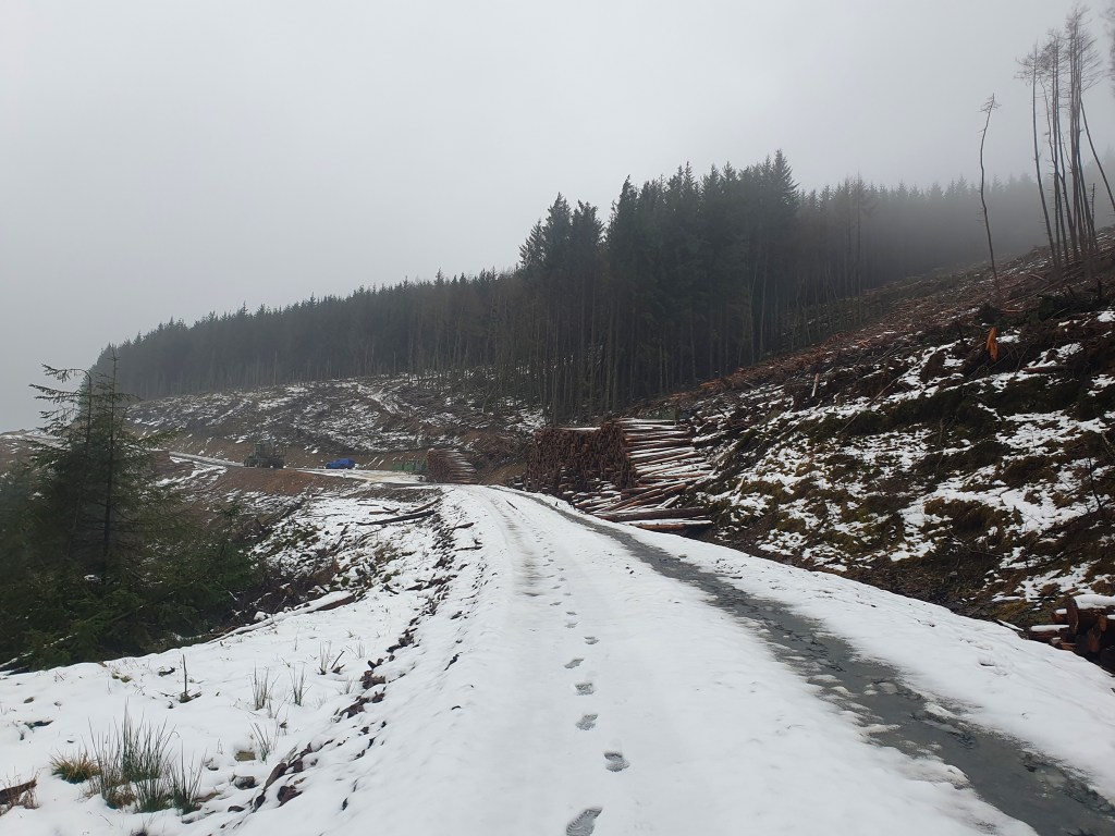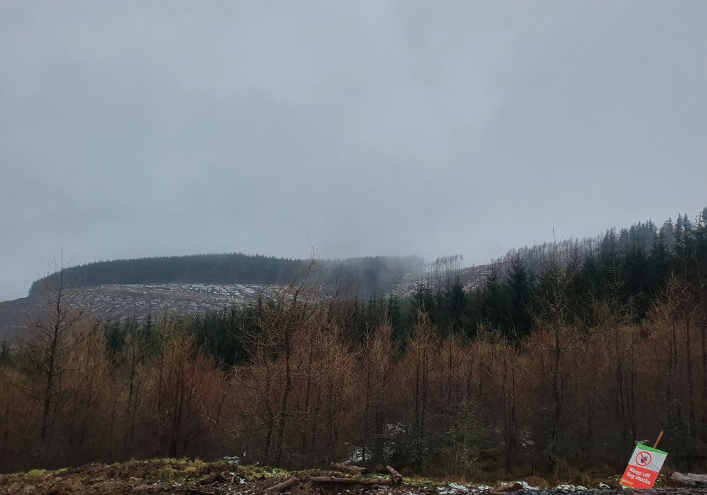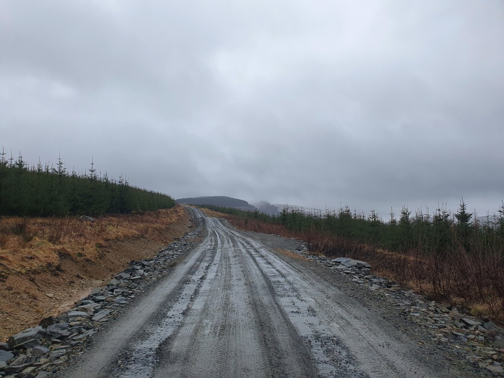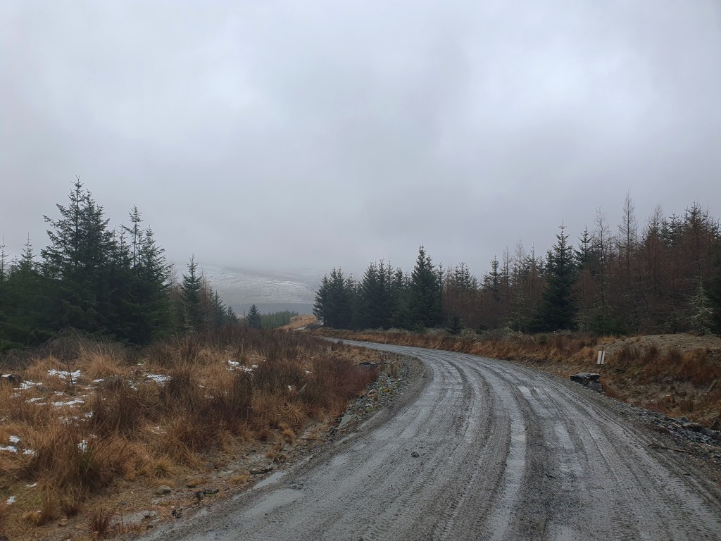 There had been only one car in the car park, no surprise really and that was my reasoning for a walk up here on a weekend, not something I usually consider but, given the weather, good call. You can just see the distant road heading up the hillside, that’s the relatively new logging road as they clear all the mature and fallen wood from the hillsides and today ….. what the heck? It’s Saturday, they won’t be working in this weather so, I’m heading that way, for a change.