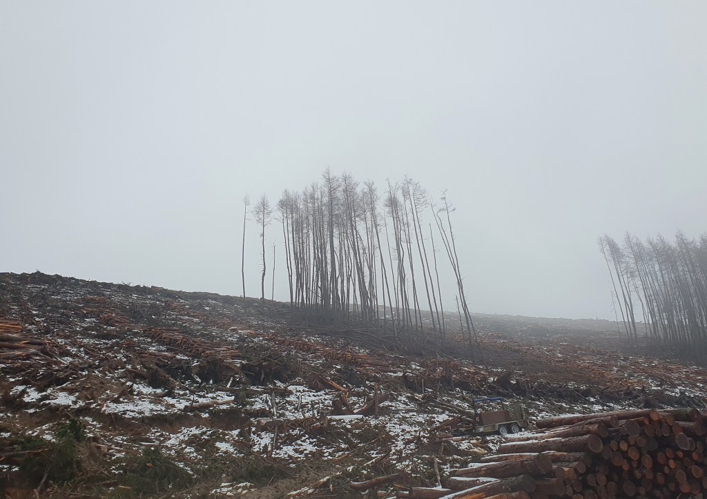 The dark smudge of distant trees to the right of those trees on the left is where I had come out of the logging trail.