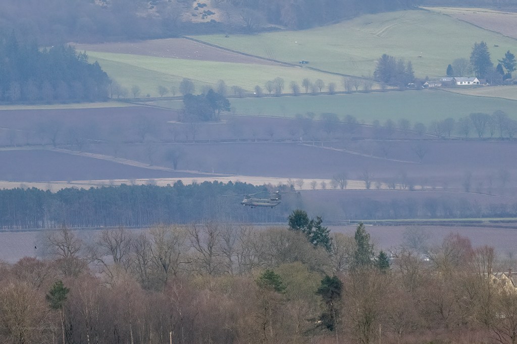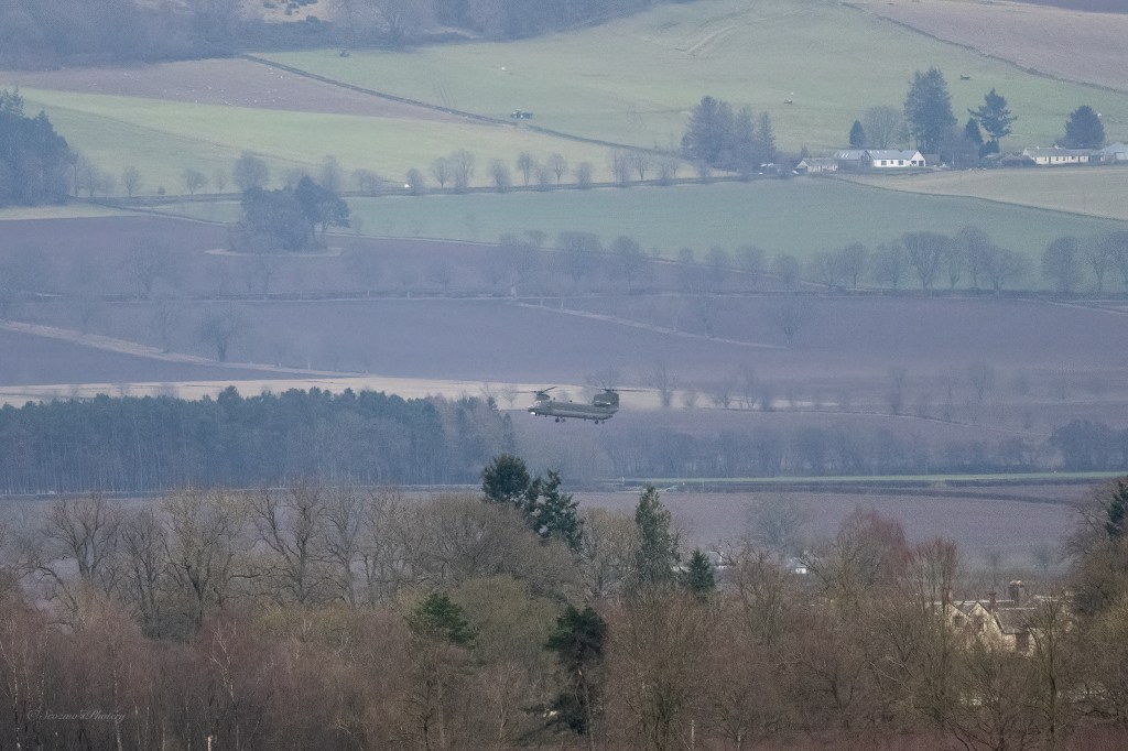 I was slow walking, listening and looking out over the Strath below. It’s a helicopter! A Chinook or an older Bell, a really deep, throbbing beat. I grabbed the binocs and started scanning the horizon and below.