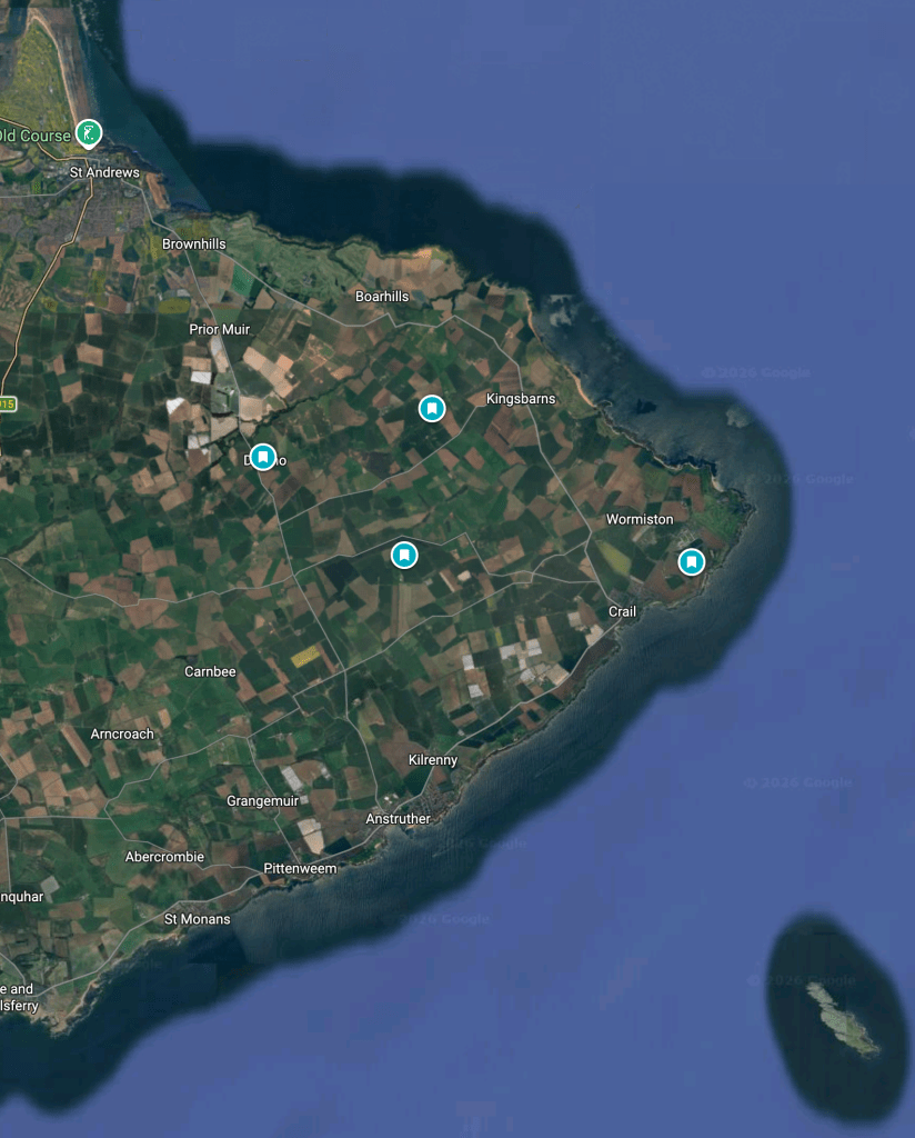 March 25th was our first visit and my first wander along the coast. My wildlife walk starts just before Kilrenny Mill caravan park and I usually walk to the cottage, top left (below) before turning back.