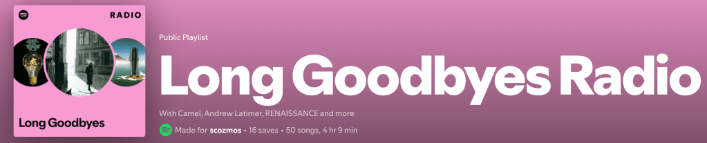 Daily listening this morning is Long Goodbyes Radio, it’s a song by Camel and rips my heart out every time I hear the guitar break. Went to see them a few years back and it was the most emotional concert I’d ever attended, I was howling several times, Andy Latimer really knows the subtlety of light and dark in a guitar solo! Music should do that for us all.
